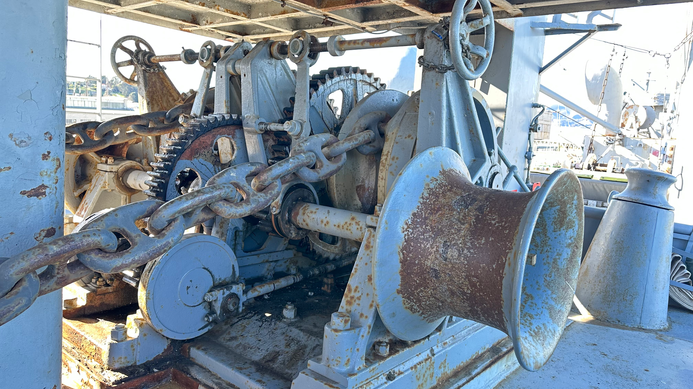 Each chain cable is 1,200 feet long, or 365 meters, the equivalent of four football fields. The O’Brien’s anchors differ slightly from each other as during restoration, one of them was sourced from a Victory ship. Liberty Ships also carried a spare anchor which was stored on the aft deck.